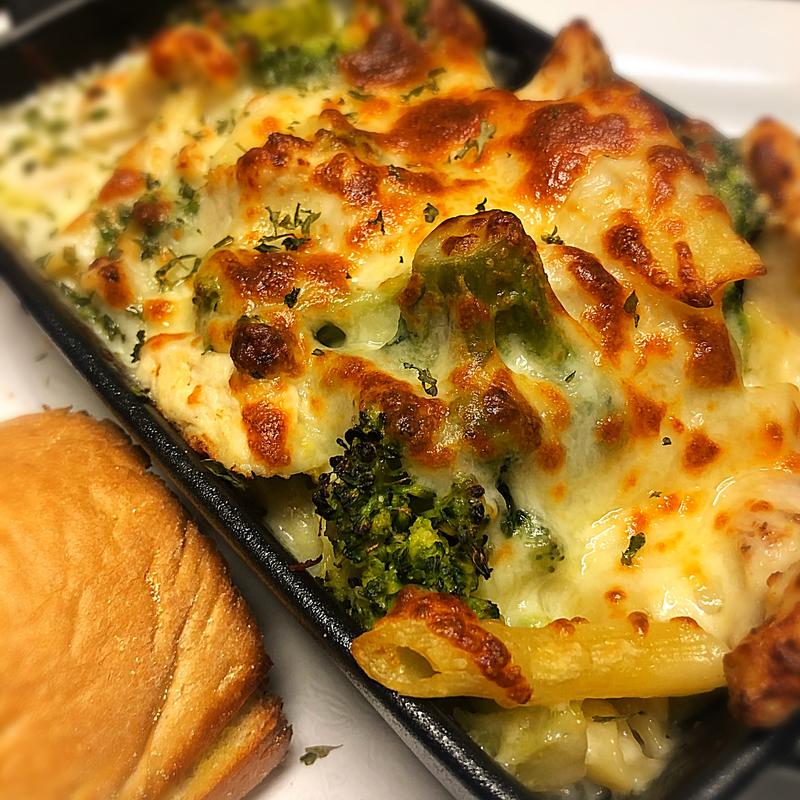 Grilled chicken, broccoli, cauliflower, penne noodles tossed in alfredo sauce, topped with mozzarella and provolone cheese and baked.