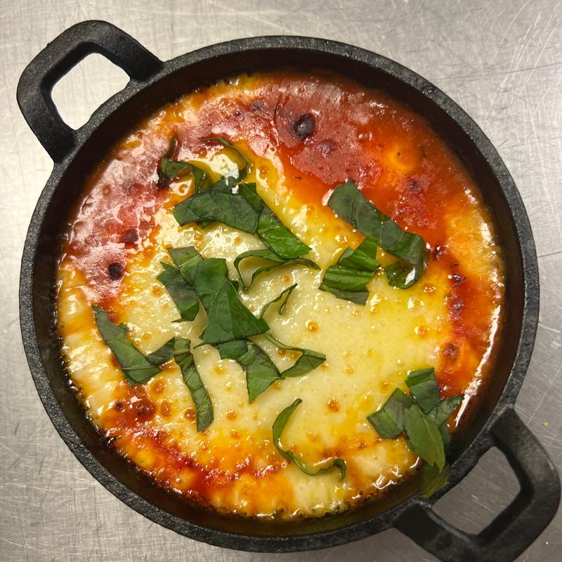 Sliced Provolone cheese, baked with sauce, and served with bread strips to dip.