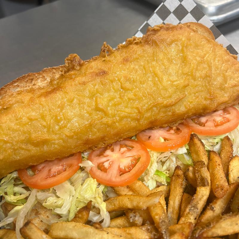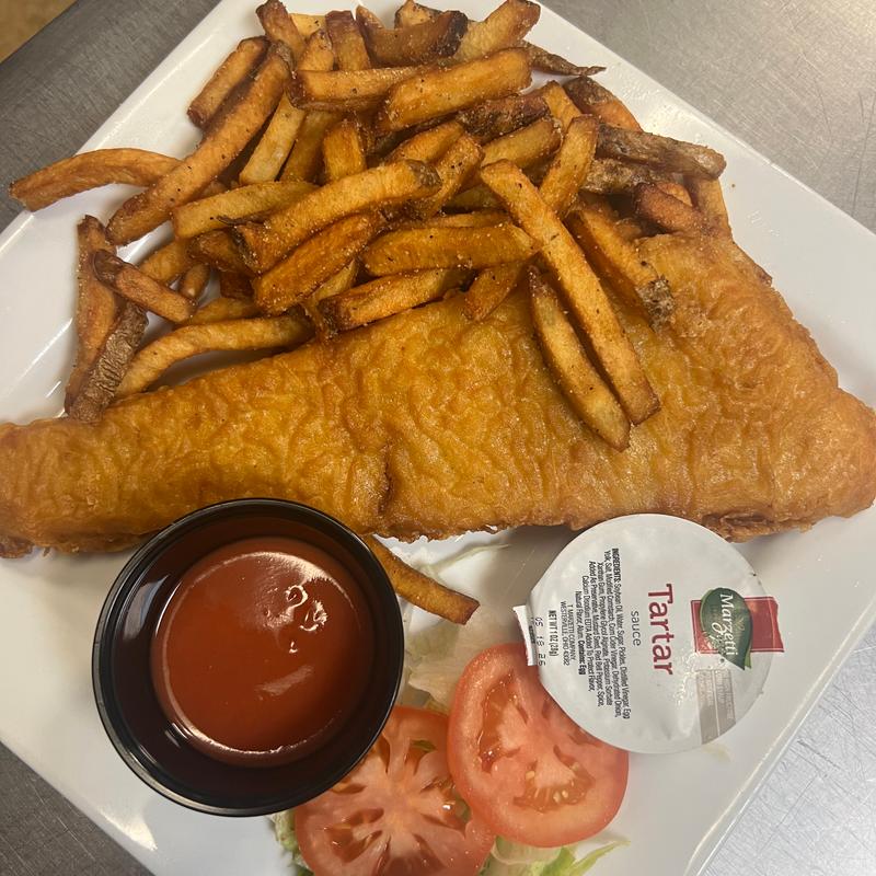 8 oz beer battered fish filet served on a bed of lettuce and tomato. Served with fries.