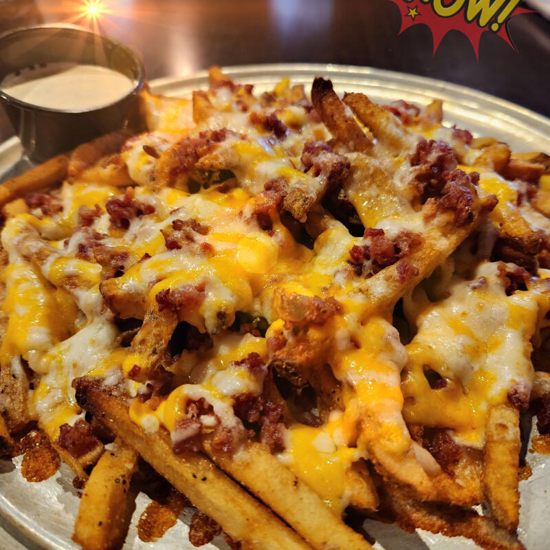 Bacon and cheese are baked on top of your choice of either fresh cut fries or shoestring fries.