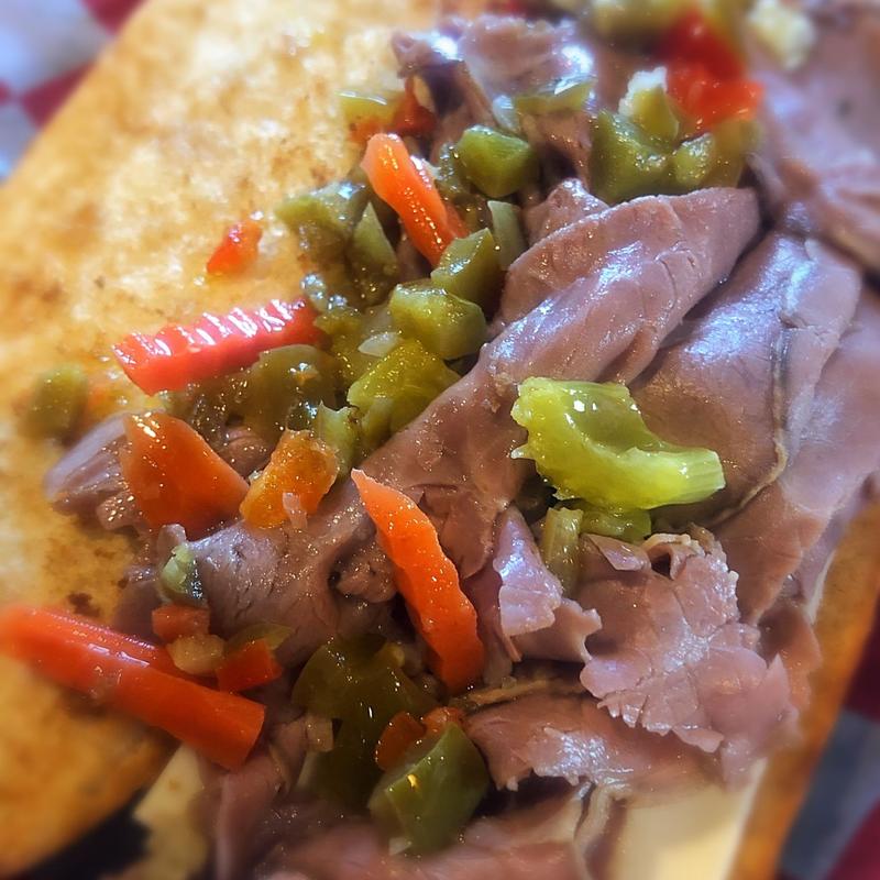 Chicago style Italian beef, white American cheese, giardiniera, and au jus served on the side.