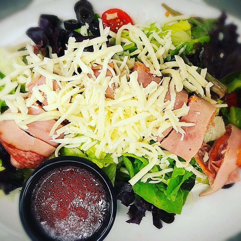 Mixed greens, tomatoes, black olives, banana peppers, ham, salami, pepperoni, mozzarella and provolone cheese.