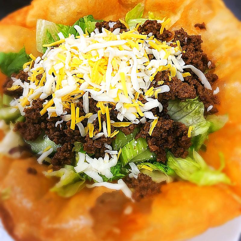 Handmade tortilla bowl with mixed greens, tomatoes, black olives, banana peppers, taco meat, topped with cheddar, mozzarella and provolone cheese.